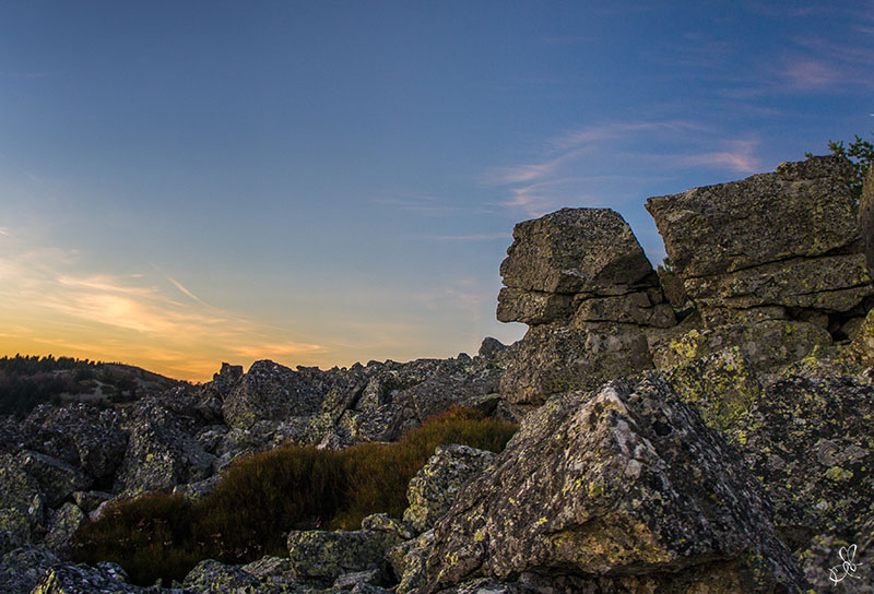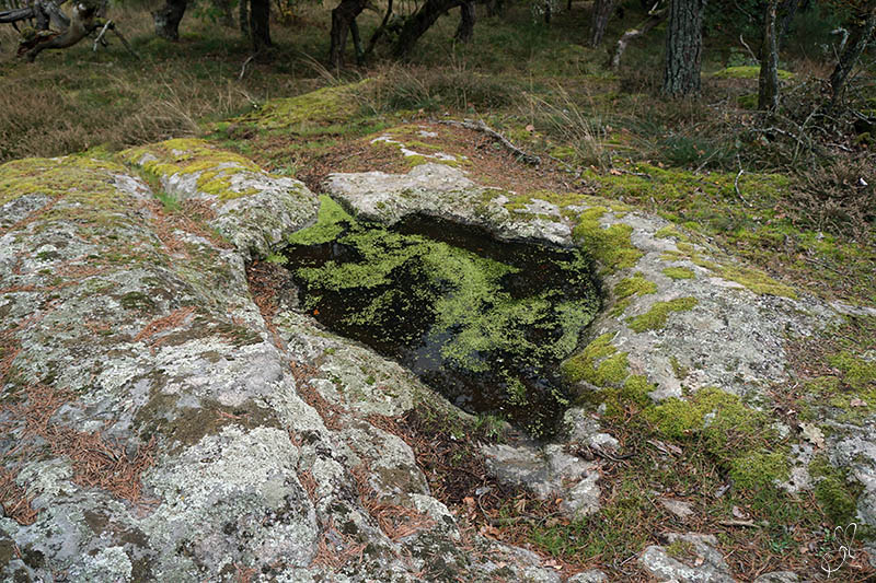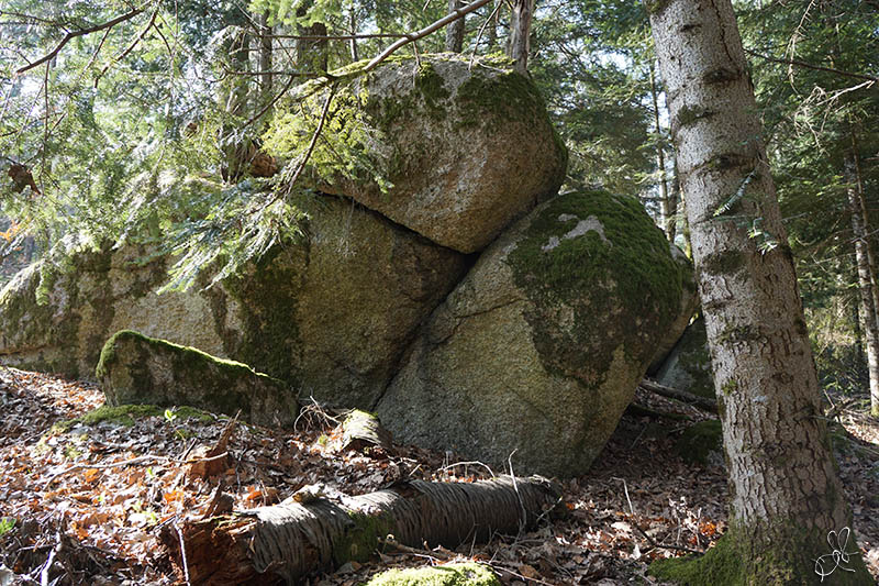 En abord du chemin muré de pierre sèches descendant la pente Est de la colline, plusieurs chaos rocheux sont visible dont l'un présentant 3 blocs bien divisés par l'effet de l'érosion (diaclases) et encore assemblés.Légende(s) attachée(s) au lieu :