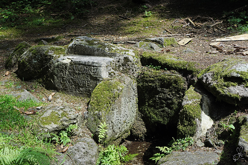 Le poème en 6 vers, gravé sur les pierres pour certaines fragmentées et réassemblées, est attribué à l'abbé Louis Jacquemin et daterait du 17ème siècle.